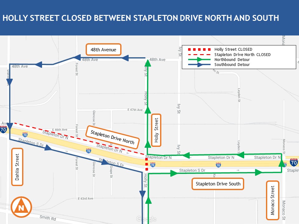 Currently, Dahlia Street under I-70 is closed between Stapleton Drive North and South. This is scheduled to reopen on February 25. Once this opens, Holly Street under I-70 will close on February 26 for approximately one month.